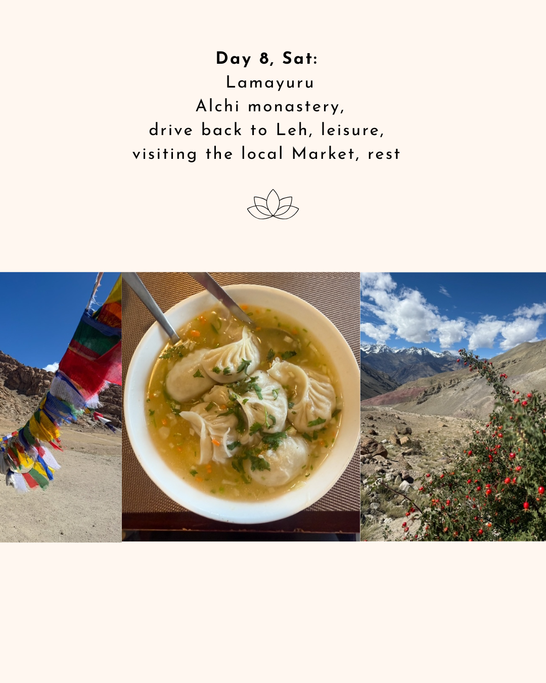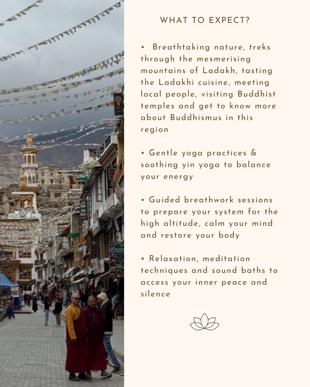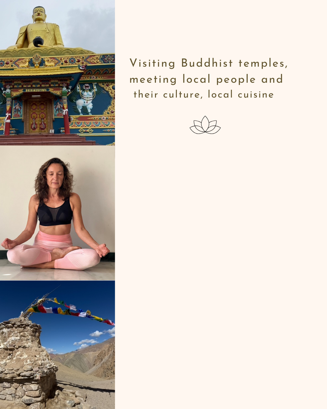 Breathtaking nature – local people – local cuisine – gentle yoga practices – breathing – free time – local market – buddhist monasteries and much more.