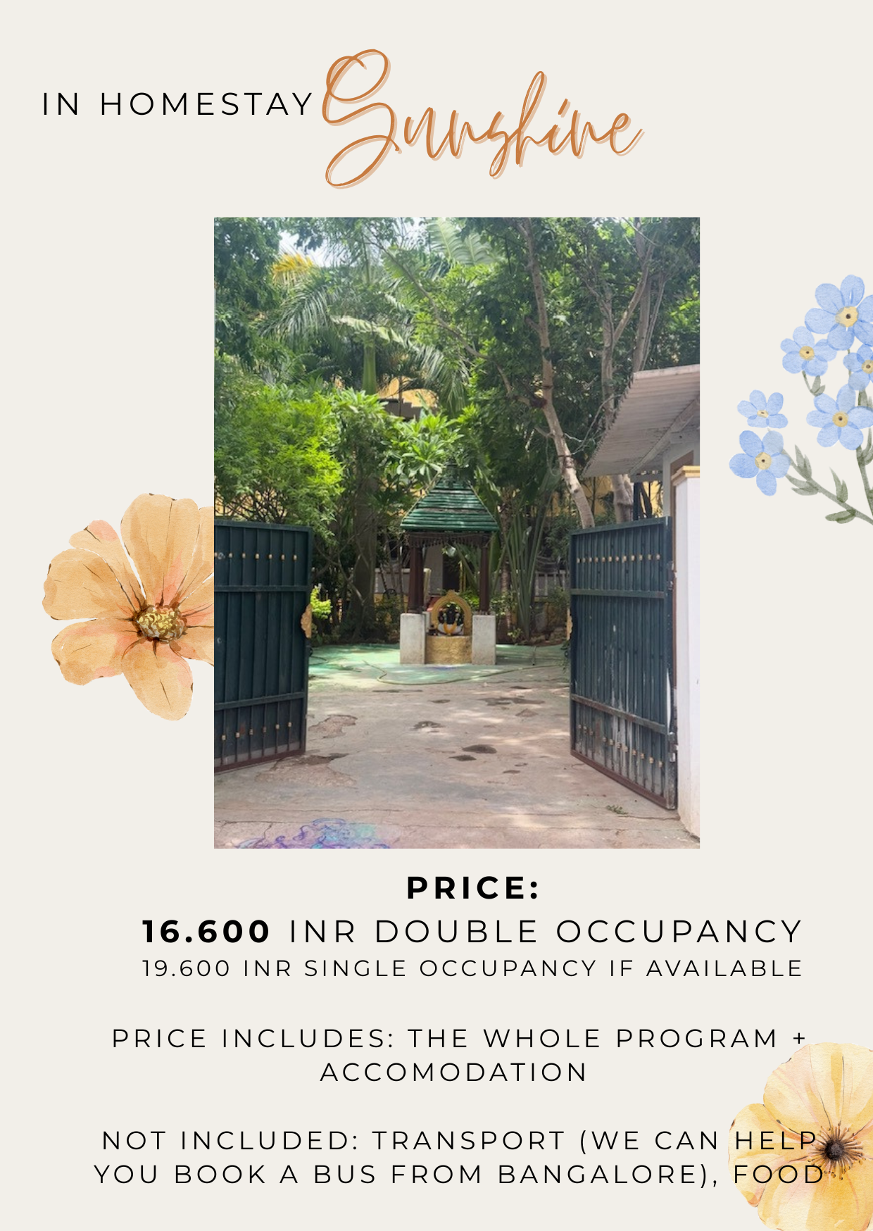 - transport (but on request we can arrange a sleeper bus from Bangalore/ and back for 800/1600 INR)